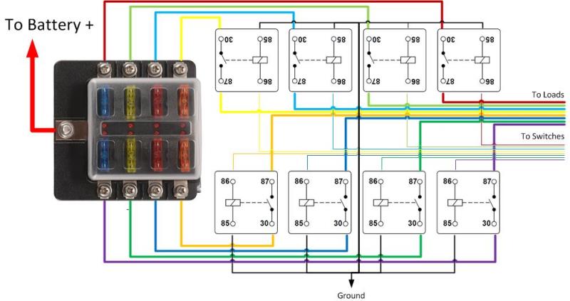 - From each fuse output, run a wire to the input terminal of the relay. On most automotive relays, this terminal will be labeled 30.